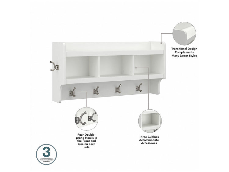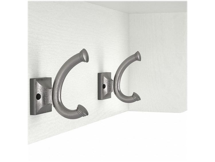 - Wall shelf includes four double-prong coat hooks in the front and one on each side for hanging jackets, hats, scarves and more