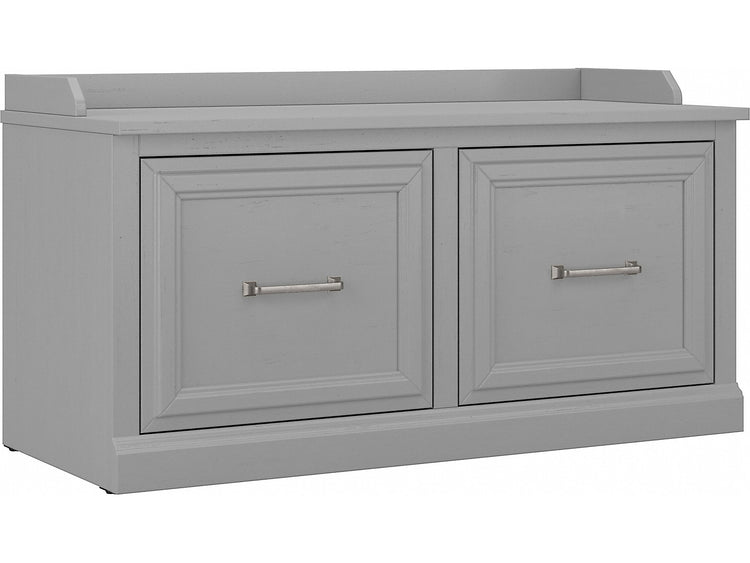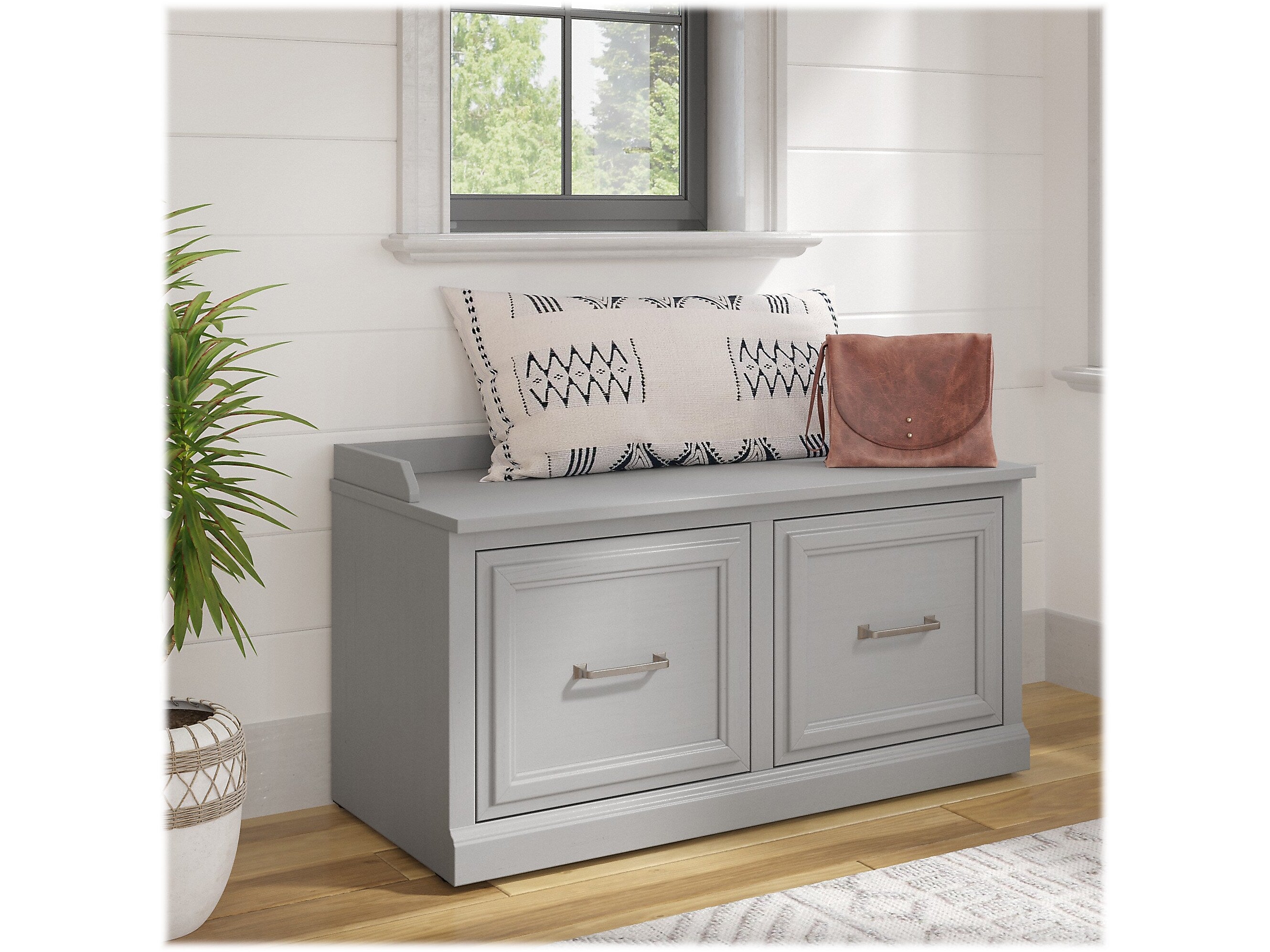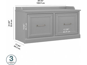 The Bush Furniture Woodland 40W Shoe Storage Bench with Doors combines transitional styling and a practical design to offer an ideal entryway organizer. Have a seat on the durable bench surface and take a moment to relax as you get ready to head out the door or come home after a long day. The top of the mudroom bench supports up to 250 pounds, so you can sit down to put on and take off your shoes or set shopping bags down after a trip to the store with confidence. Cabinet doors conceal two internal compartments that keep footwear in order and out of sight. The shoe bench's transitional design blends elements of contemporary and traditional styling to complement a wide range of home furnishings. This entryway bench with storage has been rigorously tested to meet Bush Furniture's standards for safety, performance and durability and is backed by a 3 Year Manufacturer's Warranty.