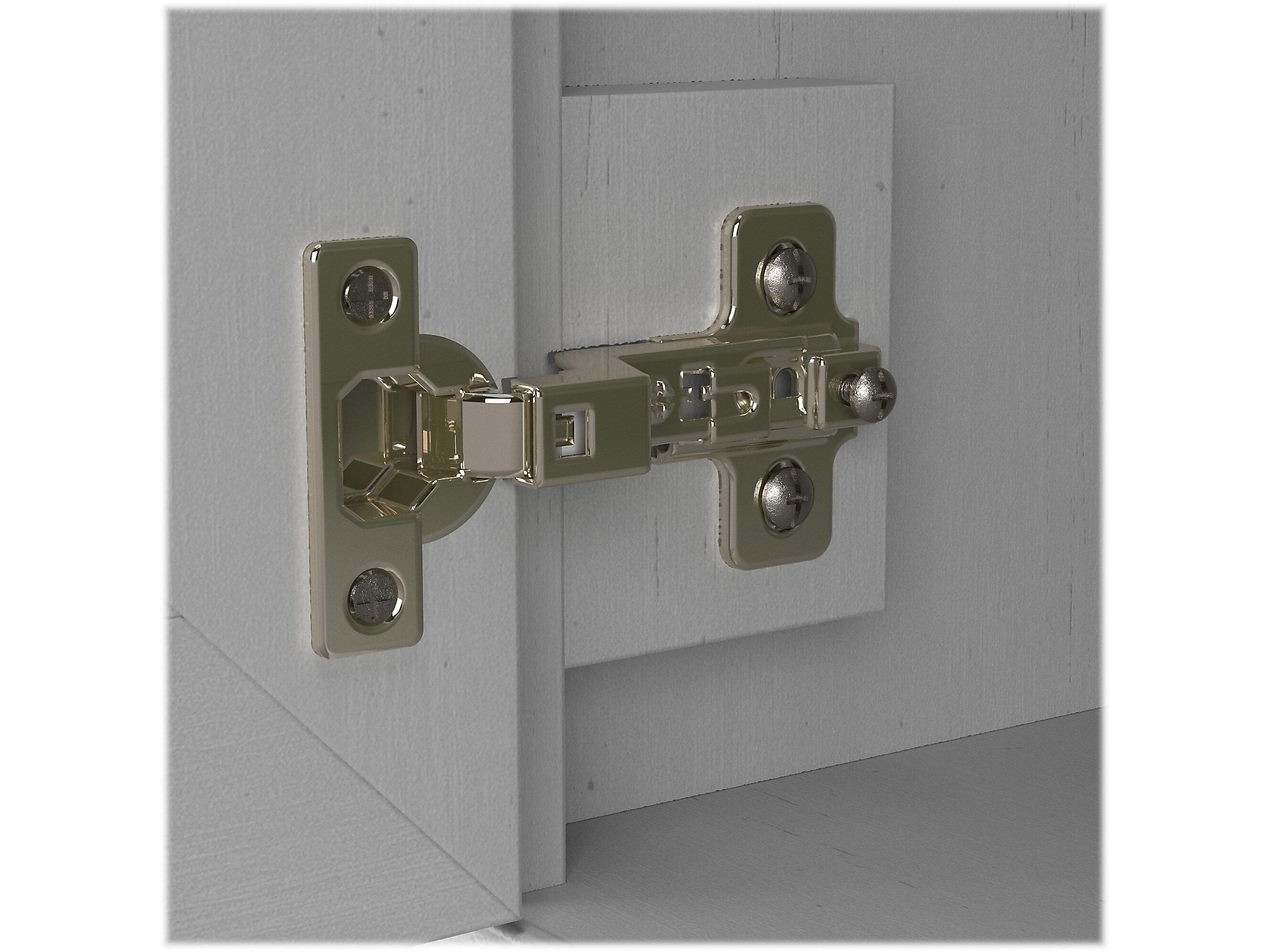 - Cabinet doors with Euro-style hinges open to reveal two compartments for storing footwear and other accessories
