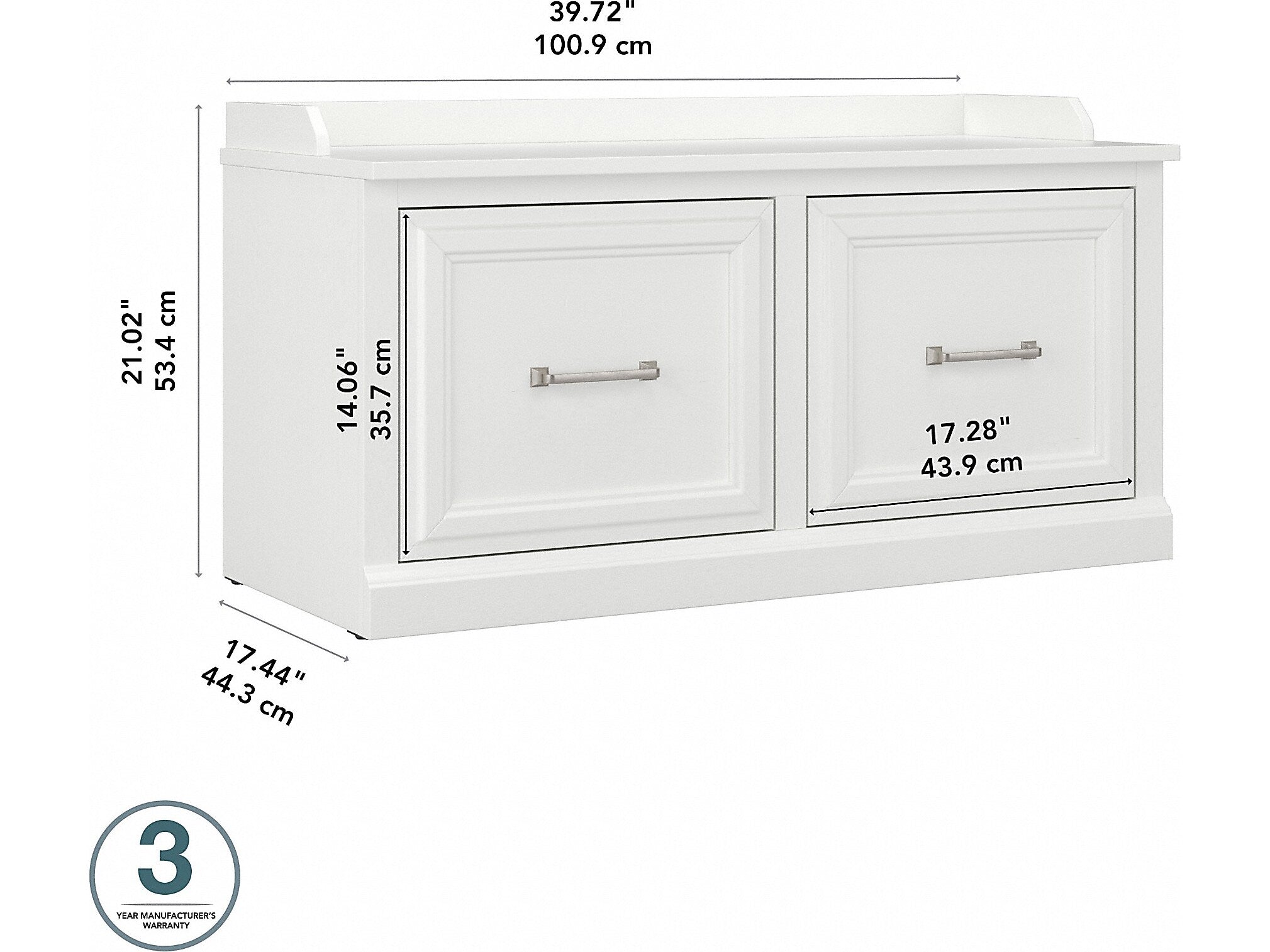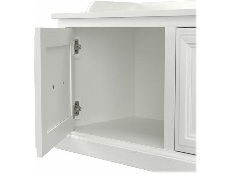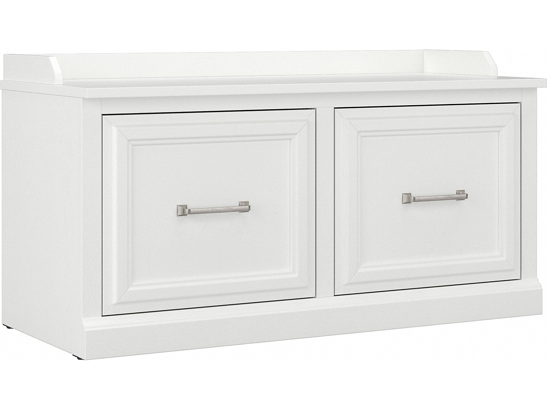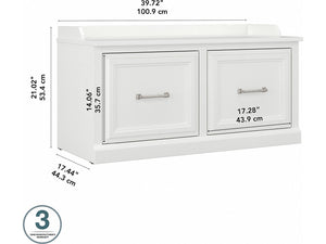 The Bush Furniture Woodland 40W Shoe Storage Bench with Doors combines transitional styling and a practical design to offer an ideal entryway organizer. Have a seat on the durable bench surface and take a moment to relax as you get ready to head out the door or come home after a long day. The top of the mudroom bench supports up to 250 pounds, so you can sit down to put on and take off your shoes or set shopping bags down after a trip to the store with confidence. Cabinet doors conceal two internal compartments that keep footwear in order and out of sight. The shoe bench's transitional design blends elements of contemporary and traditional styling to complement a wide range of home furnishings. This entryway bench with storage has been rigorously tested to meet Bush Furniture's standards for safety, performance and durability and is backed by a 3 Year Manufacturer's Warranty.