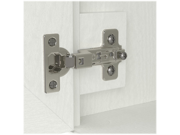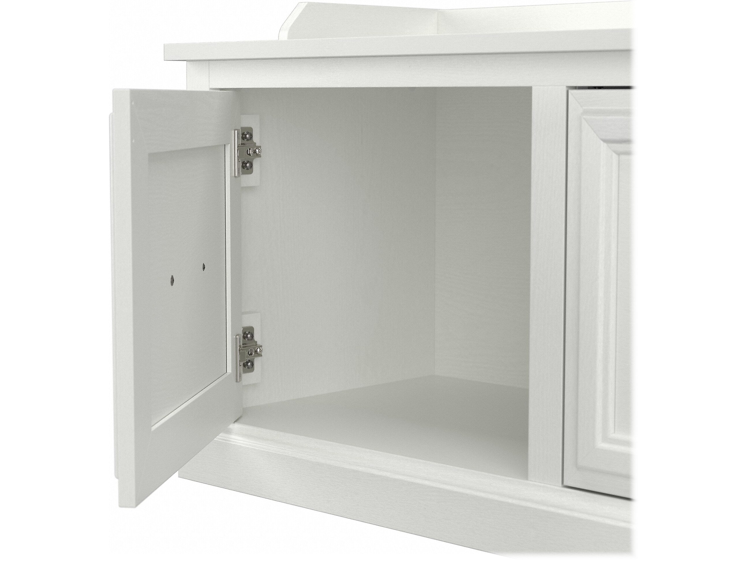 - Cabinet doors with Euro-style hinges open to reveal two compartments for storing footwear and other accessories