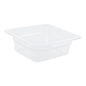 Ensure efficiency while increasing food safety in your establishment with this Cambro 62CW135 Camwear 2 1/2" deep clear 1/6 size food pan! Built to withstand temperatures from -40 to 210 degrees Fahrenheit, and made of virtually-unbreakable Camwear polycarbonate, this food pan is designed to last even in the toughest commercial kitchens. This pan won't crack, bend, or dent. Use it to store, transport, and serve all from the same pan - the clear complexion offers an easy-to-see option, while molded-in graduations in standard and metric measurements promote easy inventory management. A uniform 1/2" flange on this pan ensures a smooth fit in prep tables and food bars while a textured bottom resists scratching under everyday conditions. Inside the pan, a non-stick, smooth interior surface promotes easy cleaning while increasing yields, and a large radius bottom limits food waste. This pan won't react to food, minimizing the risk of a potentially hazardous chemical or acidic reaction. Plus, tests prove that Camwear food pans keep product as cold as stainless steel pans, with less condensation. This means your fresh produce stays fresher, longer, saving you money in the long run! When not in use, this pan stacks neatly without wedging or sticking to other pans.