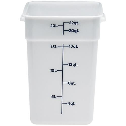 Maximize your storage space with this white 22 Qt. CamSquare container made of impact, stain and chemical-resistant polyethylene. It has easy-to-read blue graduations on the outside that let you take inventory at a glance, and you can pair this container up with the matching color-coded lid to keep things even better organized. This container withstands temperatures from -40 degrees F to 160 degrees F, making it good for both hot and cold food. WARNING: This product contains a chemical known to the State of California to cause birth defects or other reproductive harm.