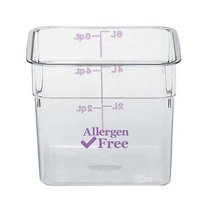 Great for storing gluten free foods in their own designated place, this Cambro 8SFSCW441 8 Qt.. food storage container will help reduce the risk of cross contamination in your facility! It features purple gradations and is labeled allergen free in bold purple letters. By using this color-coded food Storage Container, you'll be able to keep ingredients separate during preparation and reduce exposure to allergens! This 8 quart storage container makes it easy to identify allergen free ingredients in dry storage spaces and coolers. The container can withstand temperatures between -40 and 210 degrees Fahrenheit, making it perfect for use in refrigerators and freezers. Simply snap on the lid (sold separately) and this container will keep your ingredients, prepared food, or liquids fresh and ready to use! With its crystal clear design and easy-to-read graduations printed on the outside of this container, it makes "at-a-glance" inventory management easy. Made of tough Camwear® polycarbonate, this food storage container offers strength and durability for everyday use and resists dents and stains.