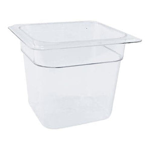 Ensure efficiency while increasing food safety in your establishment with this Cambro 66CW135 Camwear 6" deep clear 1/6 size food pan! Built to withstand temperatures from -40 to 210 degrees Fahrenheit, and made of virtually-unbreakable Camwear polycarbonate, this food pan is designed to last even in the toughest commercial kitchens. This pan won't crack, bend, or dent. Use it to store, transport, and serve all from the same pan - the clear complexion offers an easy-to-see option, while molded-in graduations in standard and metric measurements promote easy inventory management. A uniform 1/2" flange on this pan ensures a smooth fit in prep tables and food bars while a textured bottom resists scratching under everyday conditions. Inside the pan, a non-stick, smooth interior surface promotes easy cleaning while increasing yields, and a large radius bottom limits food waste. This pan won't react to food, minimizing the risk of a potentially hazardous chemical or acidic reaction. Plus, tests prove that Camwear food pans keep product as cold as stainless steel pans, with less condensation. This means your fresh produce stays fresher, longer, saving you money in the long run! When not in use, this pan stacks neatly without wedging or sticking to other pans.