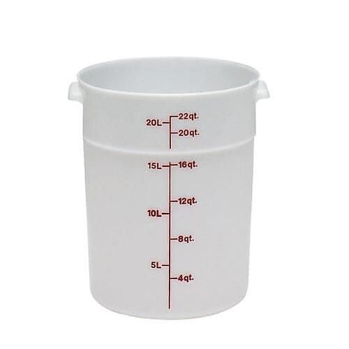 Store your perishables in this durable round storage container from Cambro. With a 22-quart capacity, this storage container's polyethylene composition is stain and chemical resistant, and keeps your products fresher longer. Its durable material is made to endure temperatures from -40 to 160 degrees F, which makes it suitable for storing hot or cold foods. Easy-to-read graduations on the exterior of this round container let you take inventory at a glance. Use Cambro's coordinating lid to stack this food storage container for even more organization.