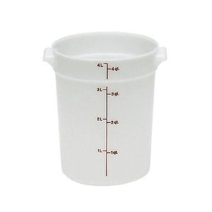 Maximize your storage space with this white 4 Qt. round container made of impact, stain and chemical-resistant polyethylene. It has easy-to-read graduations on the outside that let you take inventory at a glance, and you can pair this container up with the matching size of snap-on lid to keep things fresh for even longer. This container withstands temperatures from -40 degrees F to 160 degrees F, making it good for both warm and cold food.