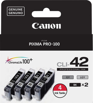 Load your printer with this 4-pack of Canon CLI-42 black, gray and light gray ink tanks to create brilliant reproductions of text, photos and other images. These tanks are compatible with Canon PIXMA printers, letting you install them in minutes for seamless operation. Proactive alert technology with these Canon CLI-42 ink tanks ensures you're never without a refill.