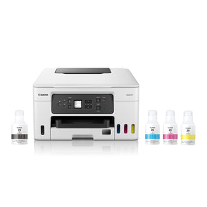 - Package includes: Canon MAXIFY GX3020 wireless all-in-one printer, set-up ink bottles (GI-26: black, cyan, magenta, yellow), documentation, power cord