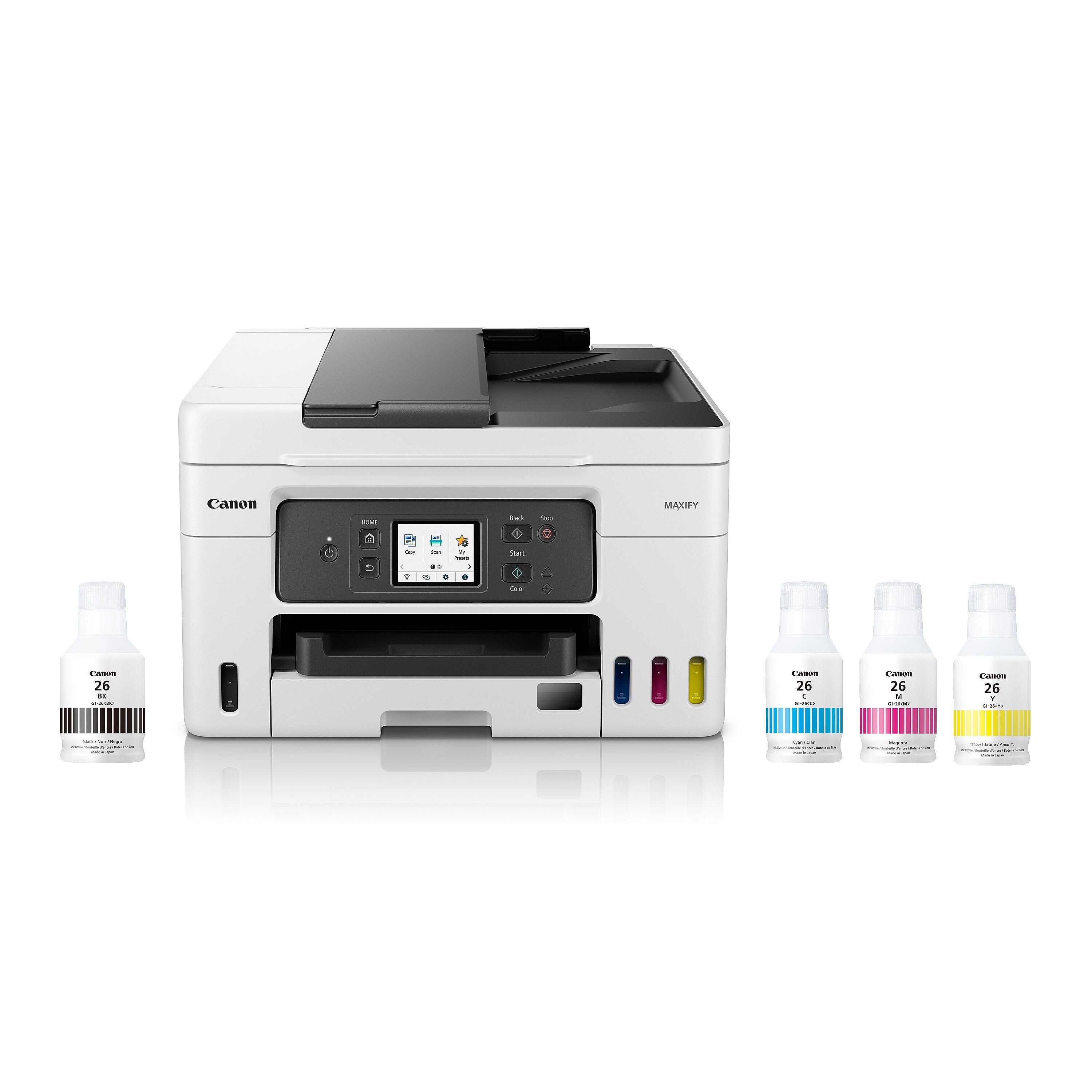 - Package includes: Canon MAXIFY GX4020 wireless all-in-one printer, set-up ink bottles (GI-26: black, cyan, magenta, yellow), documentation, power cord
