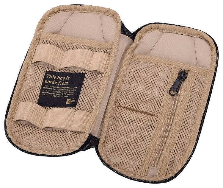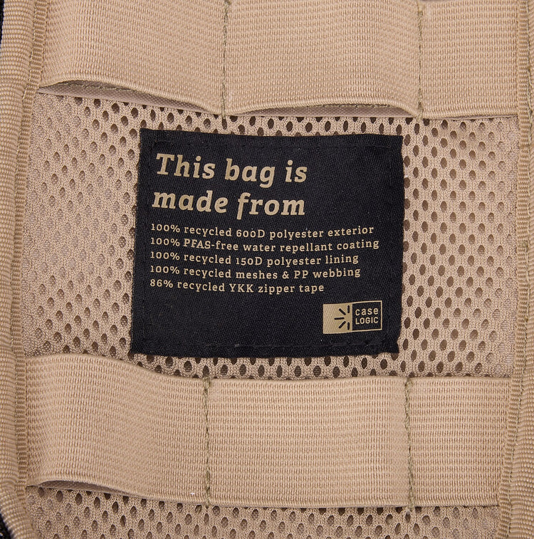 This bag is made with a 100% recycled 600D polyester exterior, 150D polyester lining, meshes, PP webbing, and 86% recycled YKK zipper tape. The water-repellent coating is also free from PFCs, chemicals that are harmful to the environment.
