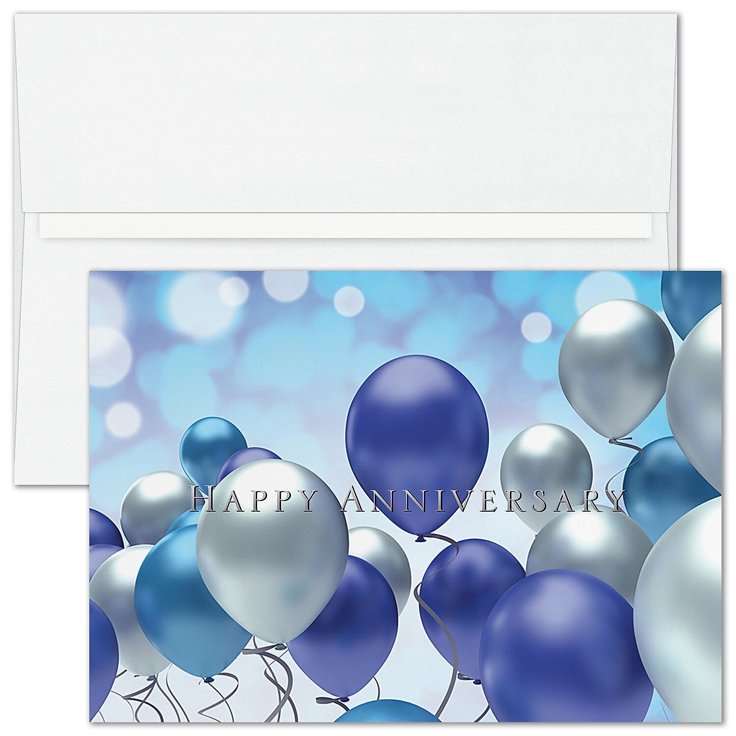 Silver and blue balloons float in the air to create a beautiful scene on this anniversary card. This card is perfect for business and personal use.