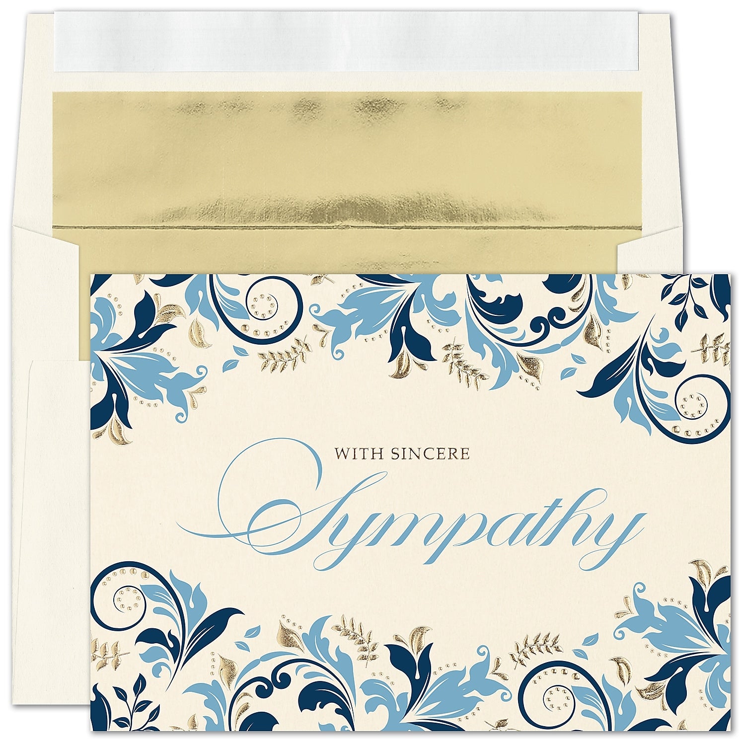 Shades of blue highlighted with embossing in real gold foil create a brocade pattern on this classic sympathy card.