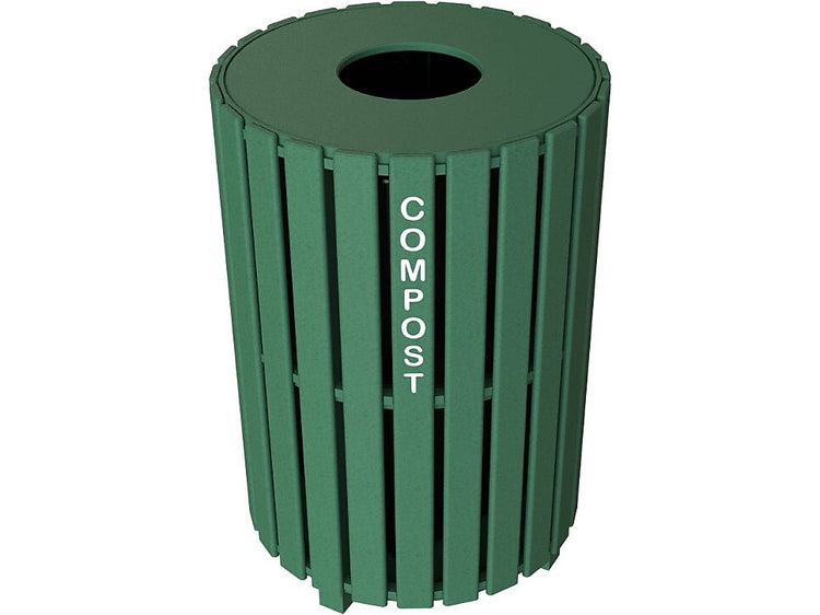 The CleanRiver Carousel recycling bin features a traditional round style with a slatted picket fence appearance. Designed with ease of access in mind, the bin is easily accessible through its top plate.