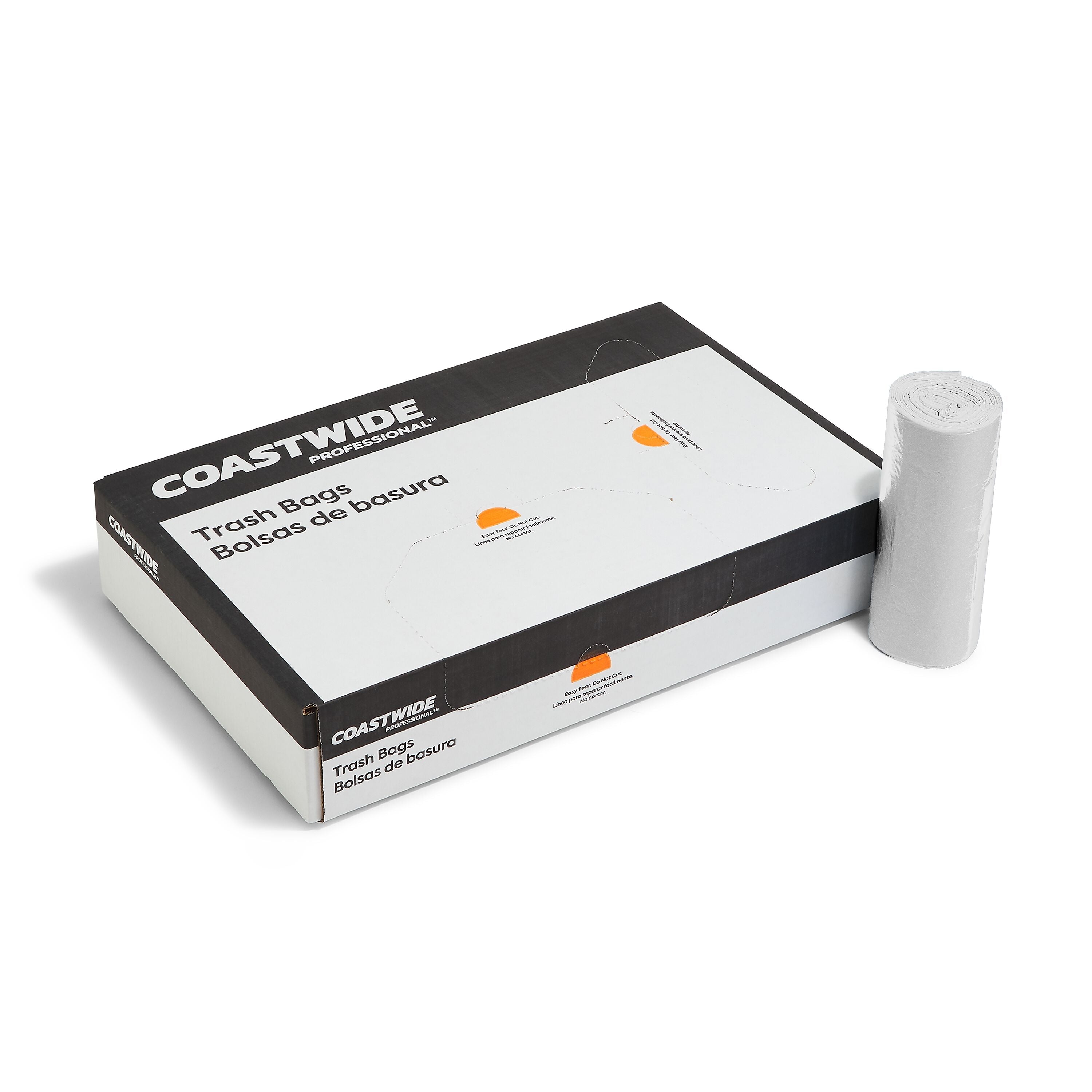 Reduce waste and clean heavy messes with trash bags made from 30% post-consumer recycled content. Capable of handling up to 33 gallons of waste, these Coastwide Professional™ 30% PCR Trash Bags are low-density, making them tear-resistant and able to contain sharp or rough materials. Make stocking up on essentials simple and more eco-friendly with this box of 200 durable garbage bags that will fit medium trash cans.