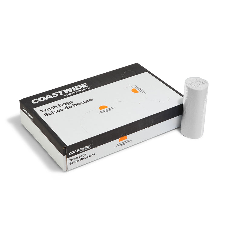 Reduce waste and clean heavy messes with trash bags made from 30% post-consumer recycled content. Capable of handling up to 60 gallons of waste, these Coastwide Professional™ 30% PCR Trash Bags are low-density, making them tear-resistant and able to contain sharp or rough materials. Make stocking up on essentials simple and more eco-friendly with this box of 100 durable garbage bags that will fit large trash cans.