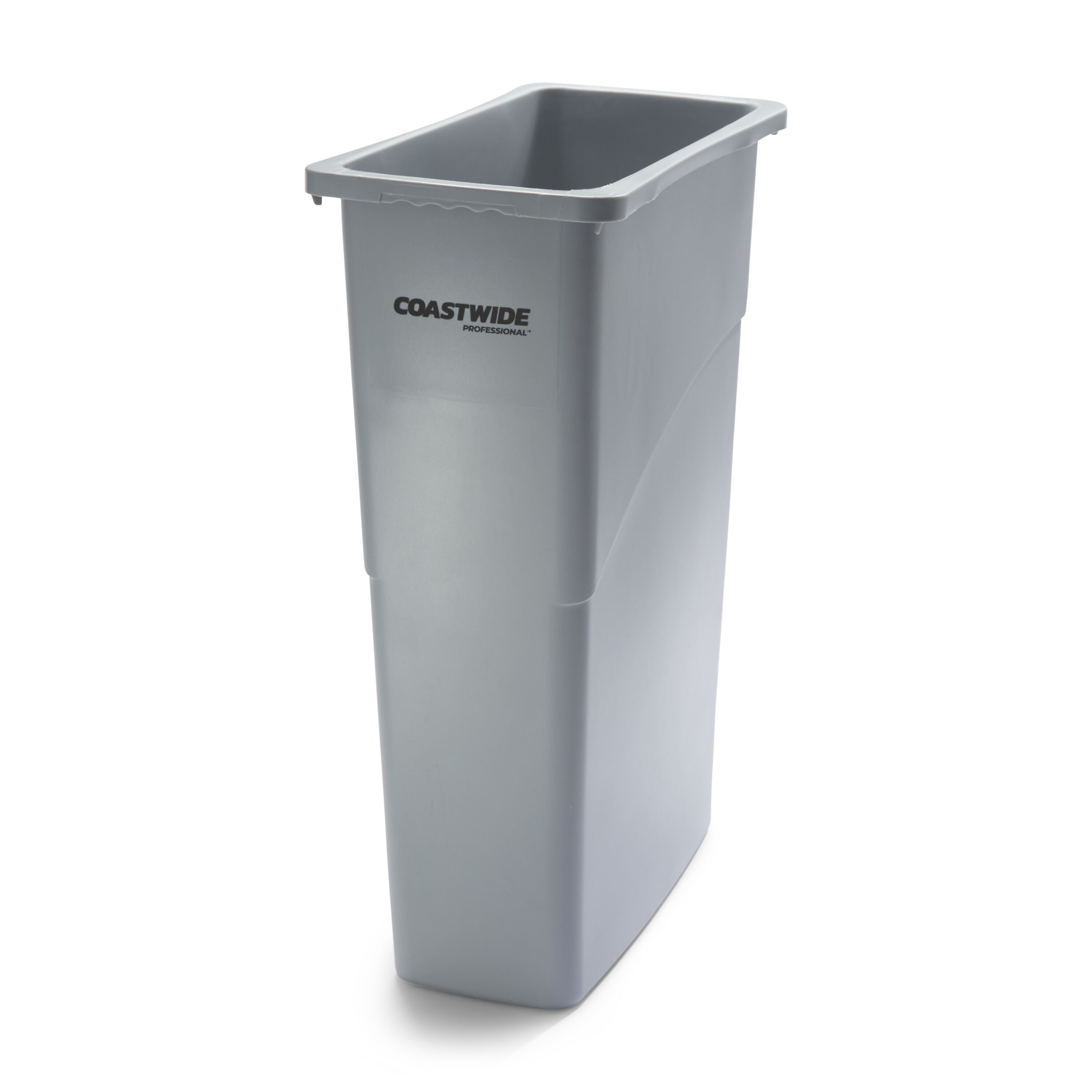 Equip indoor and outdoor spaces with this slim gray trash can. The open no-lid design allows for quick waste disposal and effortless liner placement, while the slim design fits easily within narrow stalls and corners. Use the molded handles to move the bin for cleaning, storage and emptying. This Coastwide Professional 23-gallon gray trash can has an ample capacity to accommodate a wide range of waste produced by your workspace.