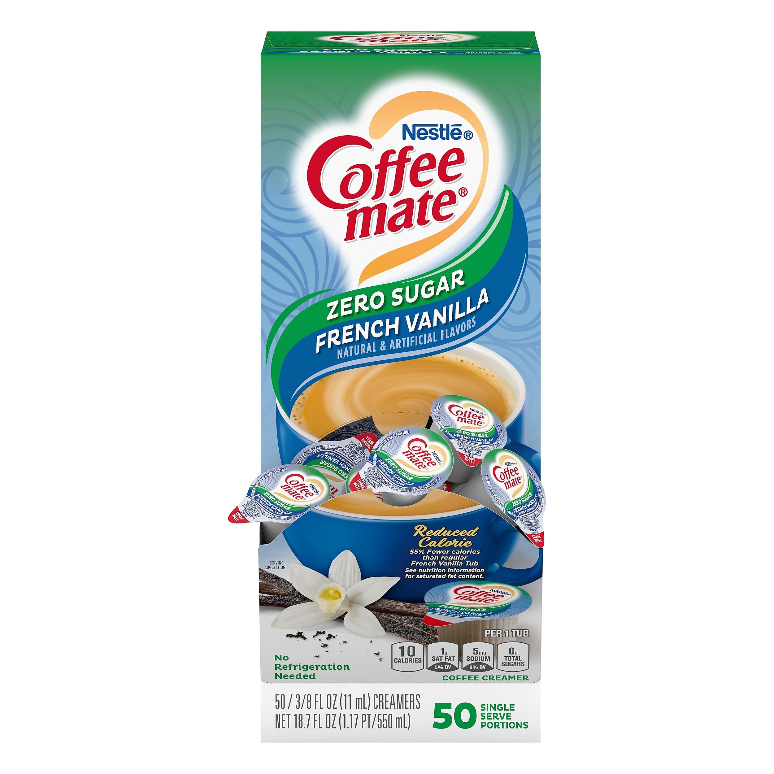 - Coffee mate Zero Sugar French Vanilla Flavored Coffee Creamer, Liquid Creamer Singles, adds a rich and velvety vanilla flavor to your cup of coffee but with 55% fewer calories than our regular French Vanilla creamer tubs