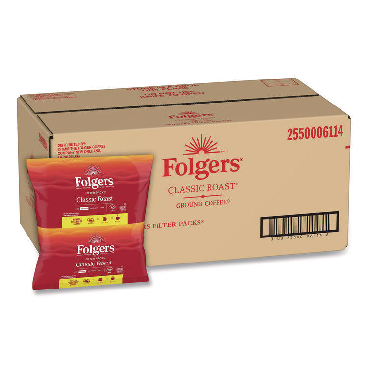Our most popular medium roast, Folgers Classic Roast is carefully blended with the world's richest and most aromatic beans delivering rich flavor and balanced character cup after cup. Proprietary filter packs put the filter plus premeasured coffee grounds all in one convenient product! No more measuring or spilling coffee grounds. The rich flavor of Folgers is more than just coffee - it's tradition. Folgers satisfies guests with the taste they love in a variety of convenient formats.