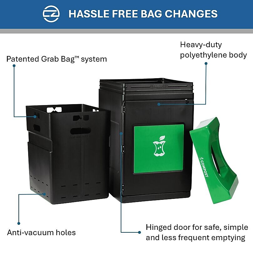 - Improved liner includes taper design, anti-vacuum holes and patented Grab Bag™ system for hassle-free bag changes.