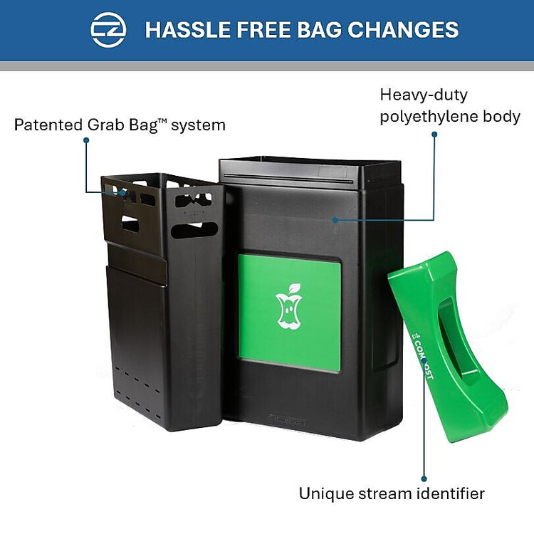 - Improved liner includes taper design, anti-vacuum holes and patented Grab Bag™ system for hassle-free bag changes.