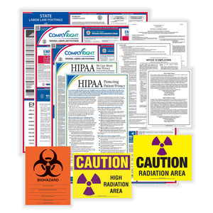 Developed to meet the additional federal and state posting needs of healthcare facilities, ComplyRight Poster Service for Healthcare offers a complete laminated federal and state poster set, along with industry-specific posters, to help healthcare employers comply with these requirements and ensure that employees are informed of their rights. This service includes one year of legal monitoring and automatic updates at no additional cost for 365 days of worry-free compliance. All posters meet strict government requirements for color, font and size. The topics covered in the posters include: Fair Labor Standards Act, Family and Medical Leave, Employee Disabilities Rights, Minimum Wage, Equal Employment Opportunity, Child Labor Law, Veteran Rights, Rad Radiation, Job Safety and HIPAA.