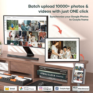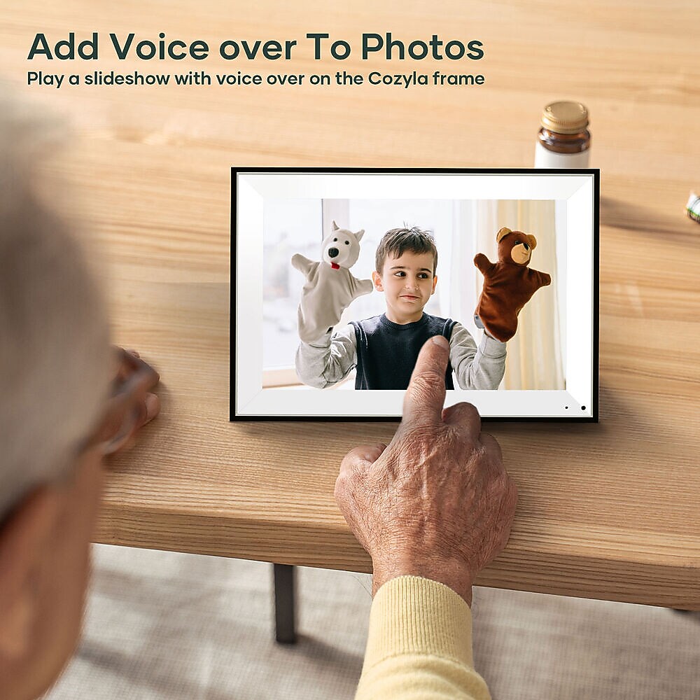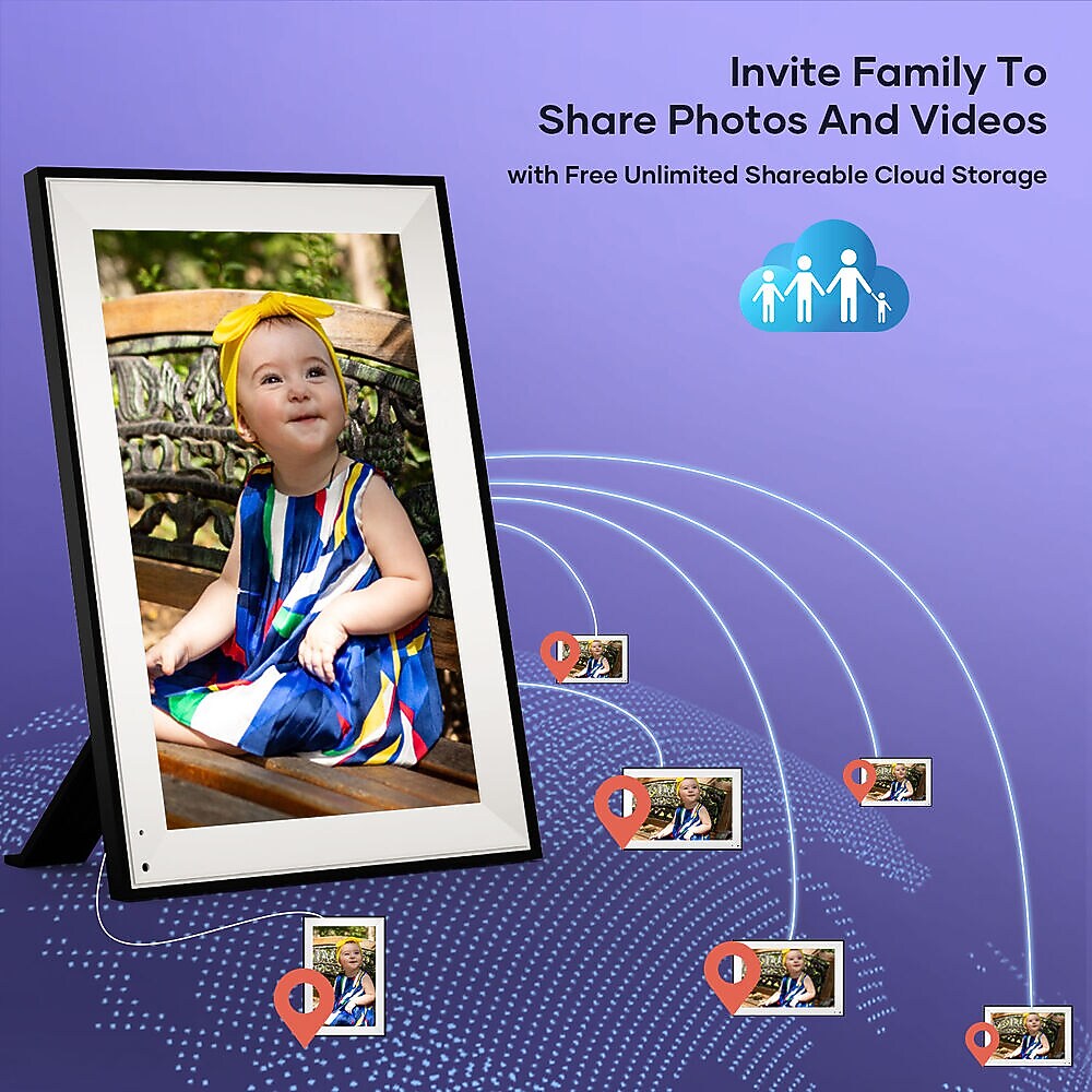 Share your photos videos, music, and slideshows with family and friends with this 10.1" Wi-Fi Digital Picture Frame from Cozyla. This frame has a 10.1" IPS display with a resolution of 1280 x 800 and a 16:10 aspect ratio. You can display it in landscape or portrait mode. Free and secure storage is provided by Amazon Web Service, with no limits on capacity.