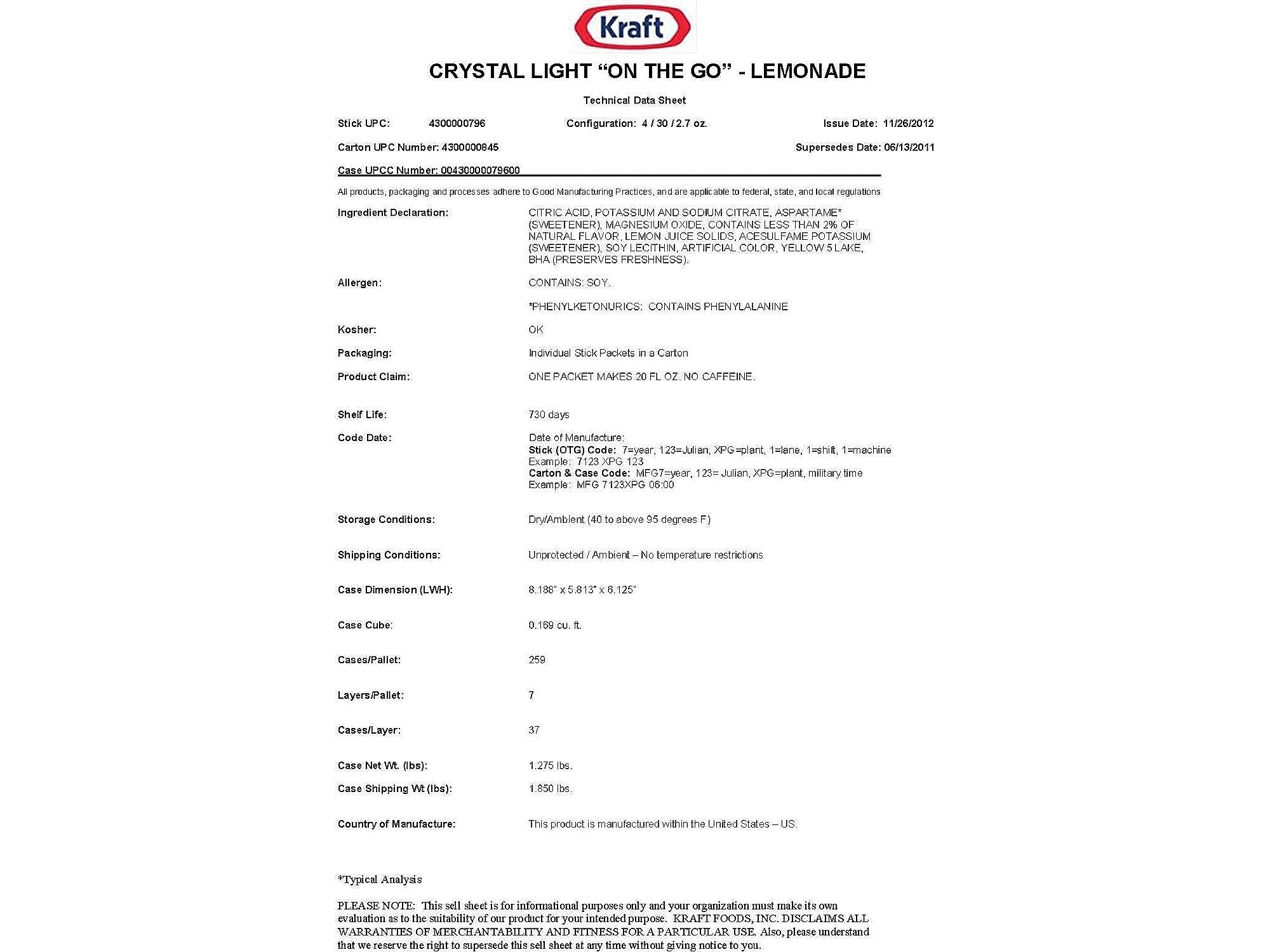 Crystal Light On The Go Natural Lemonade Drink Mix, 0.17 oz., 30/Box (00796)