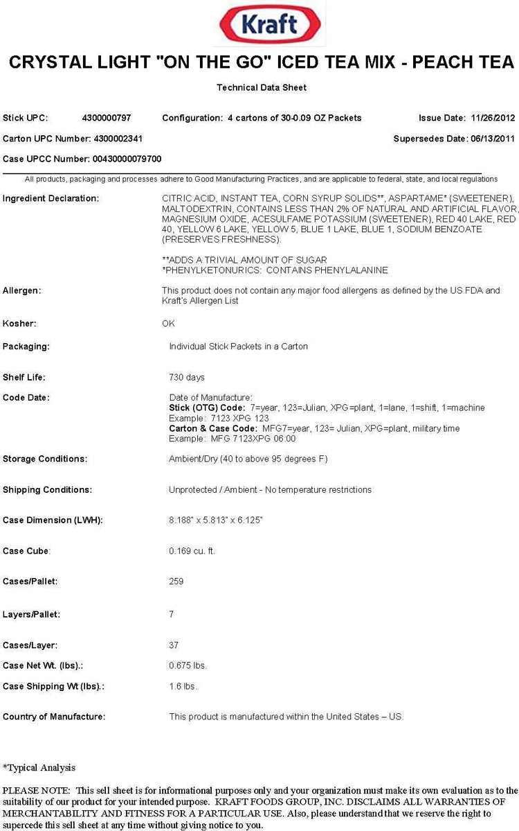 Provide a refreshing caffeine boost by keeping these tea packets in the break room, lobby, or cafeteria. This box contains 30 single-serving packets of sugar-free Crystal Light peach tea power that mixes instantly with water to create a cool, energizing beverage.