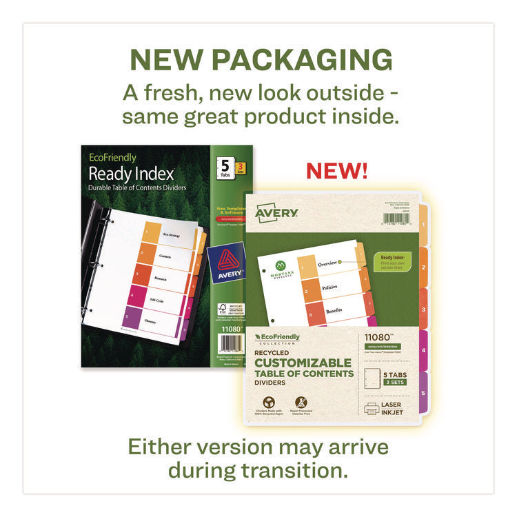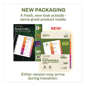 Organized documentation makes a business run like a well-oiled machine. These Ready Index Table of Contents Dividers help you stay organized so you can locate documents quickly and efficiently. They feature preprinted multicolor tabs that can be displayed in either landscape or portrait format. Using free templates from Avery Design & Print you can customize the included table of contents page and print in minutes. Organization and efficiency-makes life better for your business. For laser and inkjet printers.
