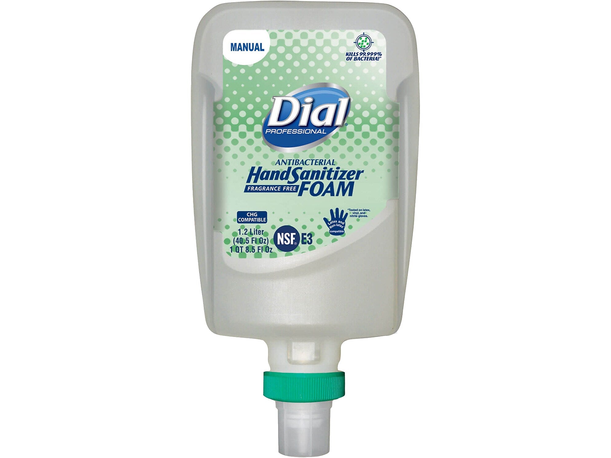 This Dial Professional FIT foaming hand sanitizer kills most of the bacteria instantly without soap and water in as little as 15 seconds. The hydrating formula is gentle on hands and moisturizes skin while sanitizing 10 times more than if left untreated. The sanitizer contains no dyes or fragrances and provides clean, convenient, and effective bacterial kill.
