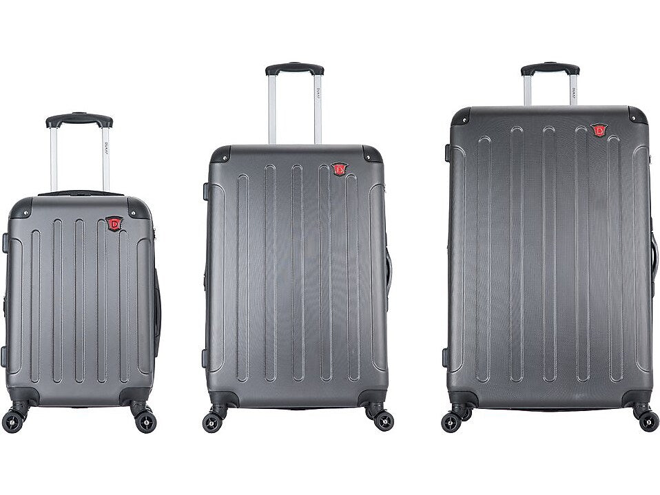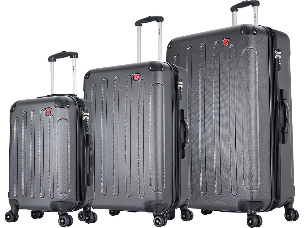 DUKAP INTELY luggage set made of lightweight PC/ABS engineered material with a micro diamond finish. The hard-flex construction offers maximum strength, durability, and a water-/scratch-resistant finish. Protective corner bumpers withstand higher impacts, and four side studs allow the luggage to stand upright. It also features a push-button locking internal retractable trolley system.