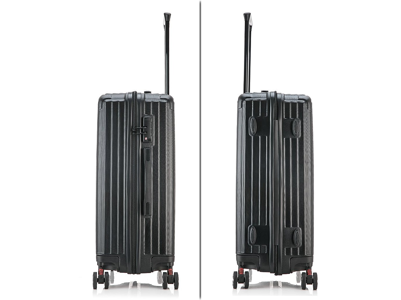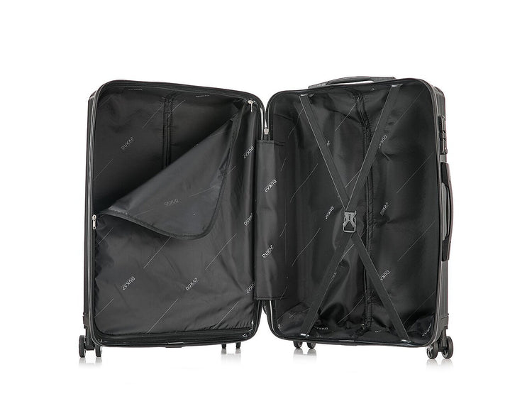 The hard-flex construction of this DUKAP STRATOS medium four-wheel spinner luggage offers maximum strength, durability, and a water-/scratch-resistant finish. It features a full 210D polyester interior fabric lining with a zipper compartment on one side and snap-on straps on the opposite side for easy packing.