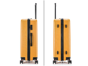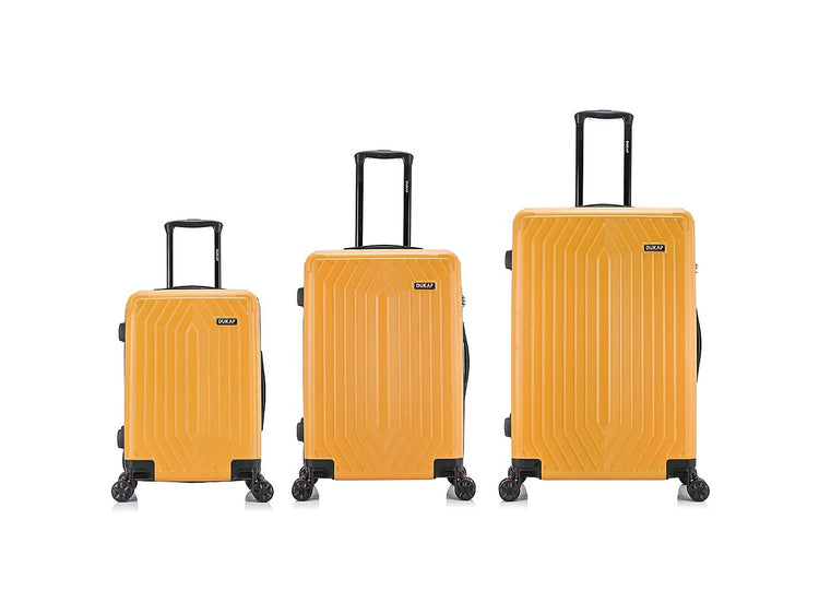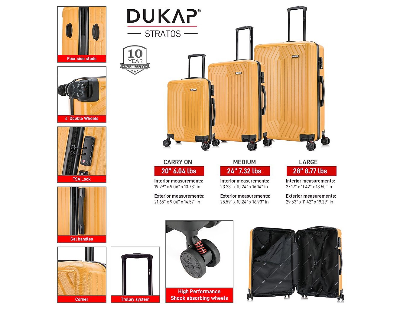 The hard-flex construction of this DUKAP STRATOS three-piece luggage set offers maximum strength, durability, and a water-/scratch-resistant finish. It features a full-interior fabric lining with a zipper compartment on one side and snap-on straps on the opposite side for easy packing.