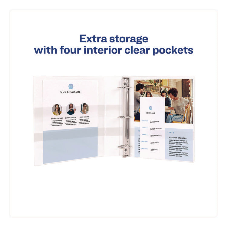 View Binder with EZD® rings was designed with a purpose—to hold more pages in less space. EZD® rings provide an increased capacity when compared to the same size slant or round rings. Tear-resistant DuraHinge® design is stronger and lasts longer. DuraEdge® feature makes the sides and top more pliable, providing greater split resistance. Deeply textured film offers a smoother finish and features a linen pattern for a high-quality look and feel. Durable construction is ideal for frequent referencing. Organize and secure papers within four interior pockets. Pages lie flat with back-mounted rings. Sturdy construction and clever design set a new standard in binder performance. Customize your binder with free templates and designs at Avery® Design & Print Online.