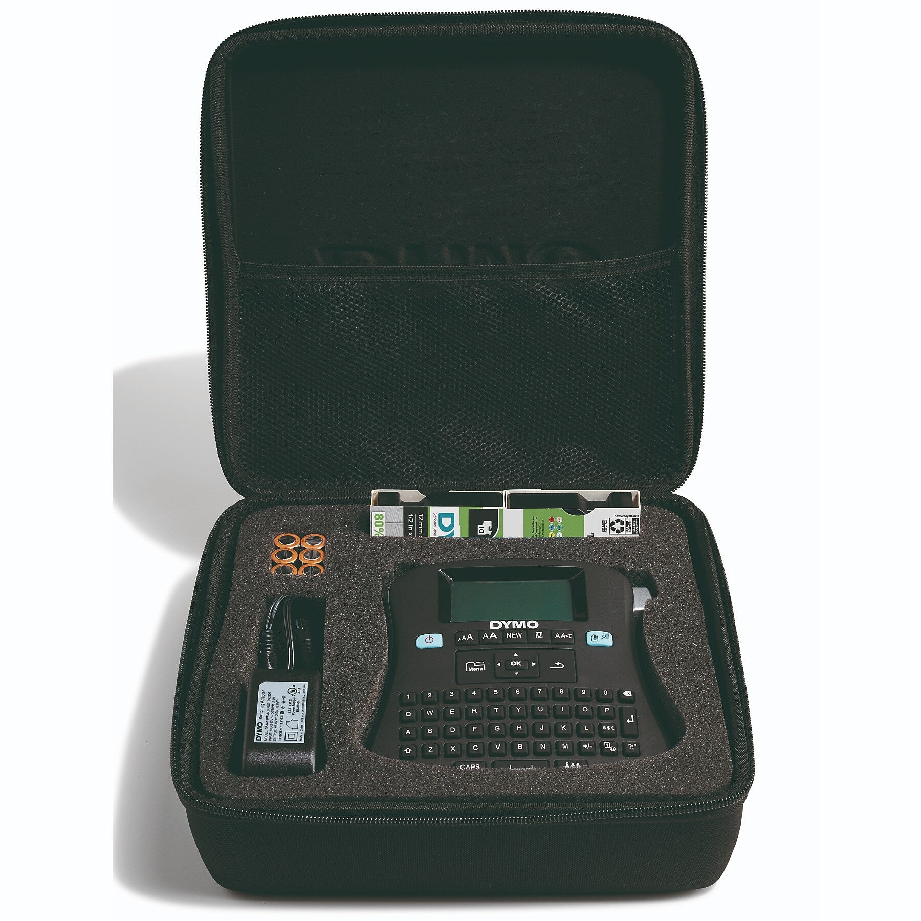 - Includes: carrying case, D1 starter label cassette (black on white 0.5" x 10'), D1 label cassette (black on yellow 0.5" x 10'), quick reference guide, six AA batteries, AC adapter, and instruction manual