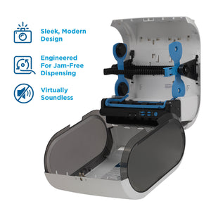 - Helps reduce waste with customizable settings including delayed dispensing, sheet length options and dispense method (hang mode vs. wave mode)