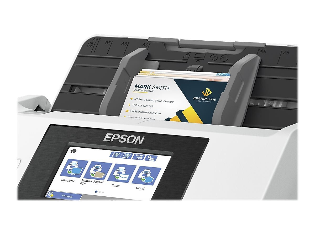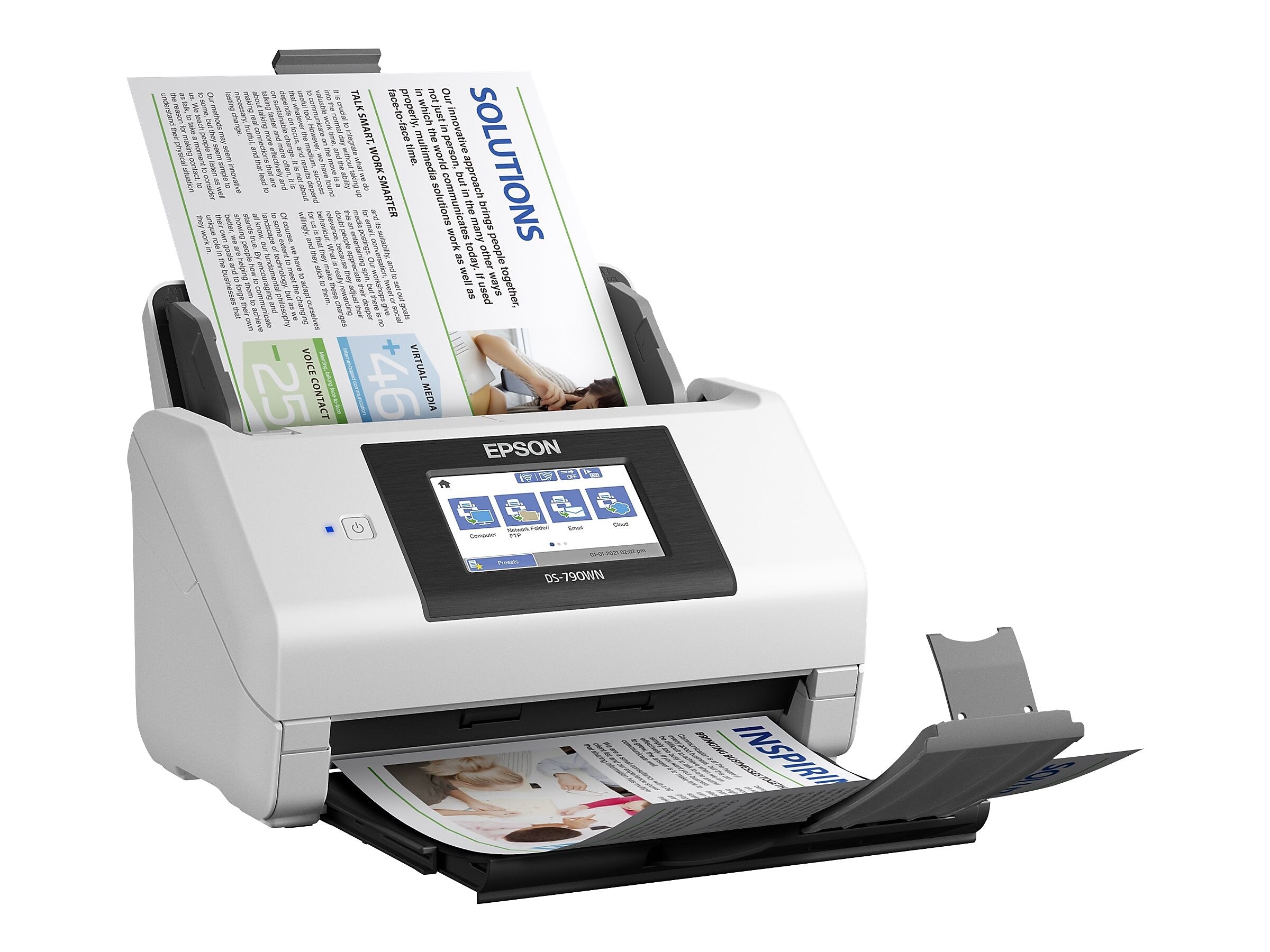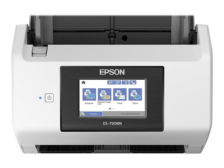 Fast, versatile and powerful, the DS-790WN combines network connectivity, enhanced security features and PC-free scanning so you can manage your business solutions with confidence. Designed for reliability plus ease of use, the DS-790WN delivers high-quality scans up to 45 ppm/90 ipm with a peak daily duty cycle up to 7,000 sheets, one-pass duplex scanning and a high-volume 100-page ADF that accommodates business and ID cards as well as extra-long pages up to 240 inches. The intuitive 4.3-inch color LCD touchscreen allows you to access multiple jobs and email or scan to a USB drive, your network or cloud storage services without the need for a computer. Gain full control of your documents with individual user authentication via the touchscreen or an optional card reader, including customizable scan settings and access to personal usage records. The DS-790WN enables efficient document management and integration to optimize your business - it includes both TWAIN and ISIS drivers for seamless integration with most existing enterprise software. With included OCR software, you can generate searchable PDF files as well as editable Office documents. Built-in LAN and Wi-Fi network connectivity allows for easy scanning, and you can scan with your mobile device using the Epson Smart Panel app on iOS or Android.