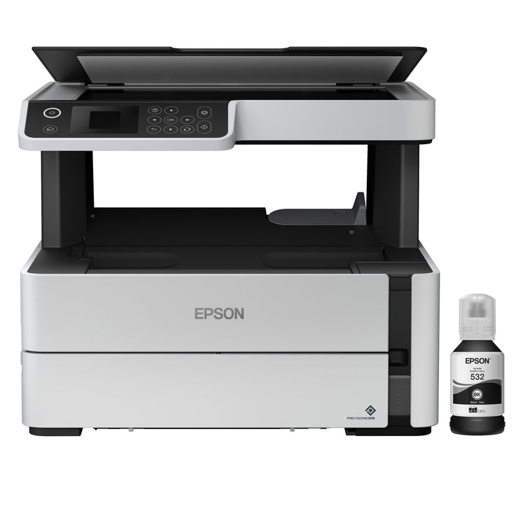 The EcoTank ET-M2170 monochrome supertank all-in-one printer, powered by PrecisionCore, offers worry-free, Cartridge-Free Printing with easy-to-fill, supersized ink tanks. Users save up to 75 percent with low-cost replacement bottles vs. mono laser toner — about 1/3 of 1 cent per ISO page vs. 2 ½ cents. The ET-M2170’s replacement ink bottle includes enough ink to print up to 6,000 pages. It features fast print speeds and a fast first page out. Plus, it offers a 250-sheet paper tray, auto 2-sided printing, and wired and wireless networking. And, you save energy with lower power consumption vs. laser. Plus, it’s backed by a 2-year limited warranty with registration.