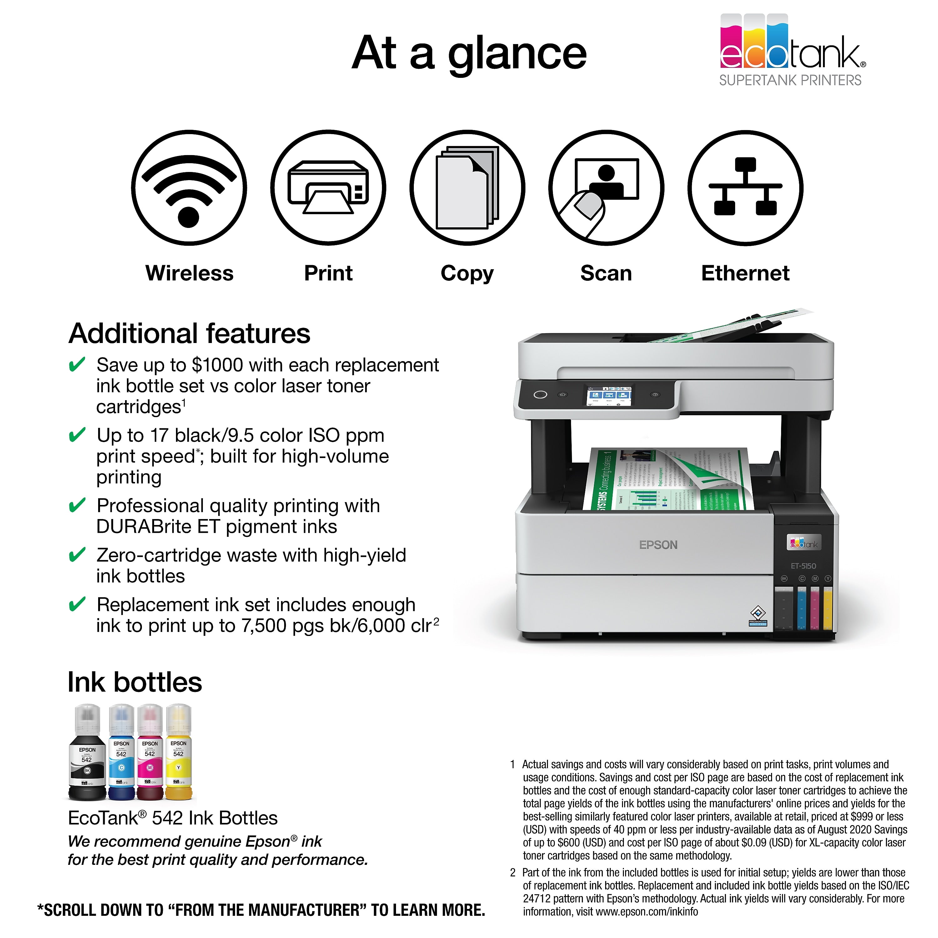 The EcoTank Pro ET-5150 all-in-one Supertank printer offers fast Cartridge-Free Printing, ideal for high-volume environments. Save up to 80 percent with low-cost replacement ink bottles vs. standard-capacity color laser toner cartridges – that’s about 2 cents per color ISO page versus 14 cents with cartridges. Engineered for high productivity in a small footprint, the ET-5150 delivers professional-quality prints face down for greater privacy. Epson DURABrite ET pigment ink ensures vibrant prints. This hardworking printer offers demanding businesses reliability they can count on, including a 2-year limited warranty with registration and permanent printhead designed to last the life of the printer. Plus, there’s zero cartridge waste.