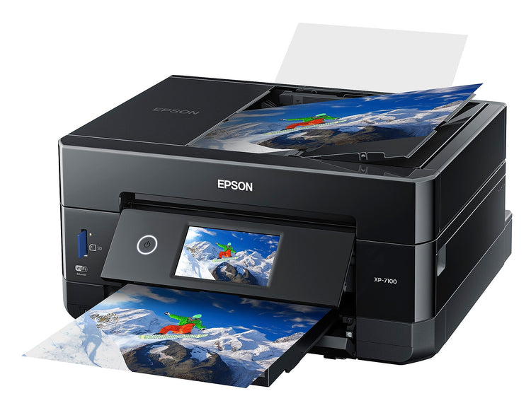 The 5-color Expression Premium XP-7100 wireless Small-in-One printer delivers superior photo quality and versatility, ideal for productive, creative families. Save time with a 30-page Auto Document Feeder and auto 2-sided printing, copying and scanning. Print vivid, borderless photos up to 8" x 10", or on specialty paper and DVDs. The intuitive 4.3" touchscreen allows you to view, edit and print photos, directly from a USB or card slot. And, you can easily print from your tablet or smartphone — with or without a router — at home or on the go. Plus, print 4" x 6" photos in as fast as 12 seconds, as well as custom projects with the Creative Print App.