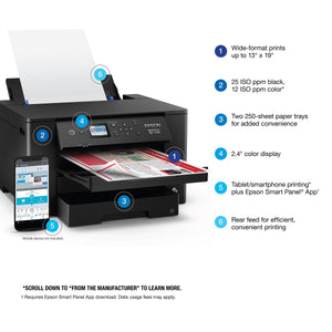 Enhance office productivity with the high-powered WorkForce Pro WF-7310. A high-performance, wide-format printing solution, the WorkForce Pro WF-7310 delivers print-shop-quality graphics up to 13" x 19" and borderless up to 11" x 17". Offering fast print speeds, this efficient printer streamlines workflow at an astounding 25 black/12 color ISO ppm. Designed with durability and reliability in mind, the WorkForce Pro WF-7310 features PrecisionCore Heat-Free Technology and DURABrite Ultra instant-dry pigment inks to quickly and consistently deliver crisp, vibrant prints with sharp text and vivid colors. The perfect choice for fast, efficient printing, the WorkForce Pro WF-7310 easily tackles high-volume print jobs with two 250-sheet trays, a rear feed and Wi-Fi 5 compatibility. Plus, with the Epson Smart Panel App, you can conveniently manage printer workflow from your smart device.