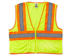 Ergodyne® GloWear® 8229Z 4XL/5XL lime class 2 Hi-vis economy two-tone vest with 2" reflective tape is made of 3.6 oz polyester solid for longer life. Vest with zipper closure includes a reflective set on 4 1/2" contrasting color background.