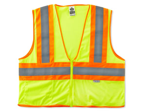 Ergodyne® GloWear® 8230Z 4XL/5XL lime class 2 Hi-vis two-tone vest with 2" reflective tape is made of 3.6 oz polyester solid for longer life. Vest with zipper closure includes a reflective set on 4 1/2" contrasting color background.