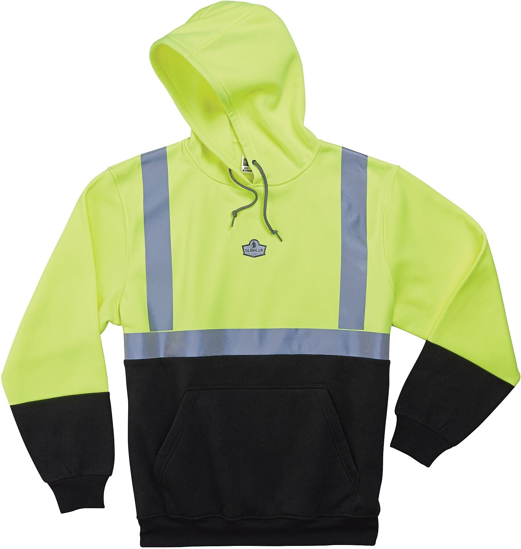 Ergodyne® GloWear® 8293 4XL lime class 2 hooded Hi-vis sweatshirt with black accents on front and sleeve is made of 8 oz polyester polar fleece for longer life. Shirt has 2" heat transfer reflective tape with drawstring hood for more comfort.