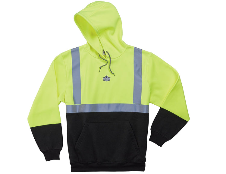 Ergodyne® GloWear® 8293 Medium lime class 2 hooded Hi-vis sweatshirt with black accents on front and sleeve is made of 8 oz polyester polar fleece for longer life. Shirt has 2" heat transfer reflective tape with drawstring hood for more comfort.