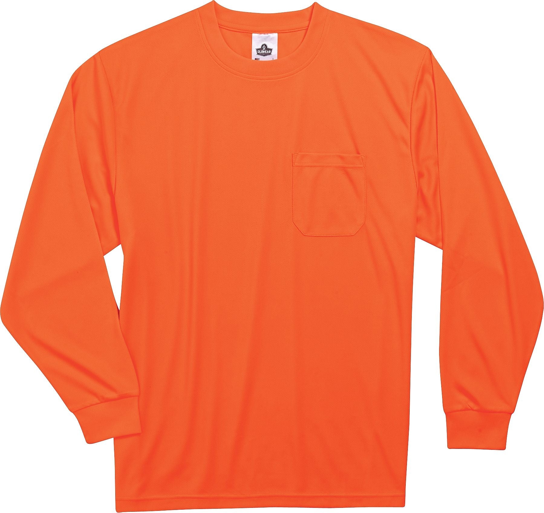 Ergodyne® GloWear® 8091 4XL orange non-certified long sleeve Hi-vis T-shirt with moisture wicking treatment is made of 4.1 oz polyester breathable knit for longer life. T-shirt is used by cart wrangler, handler and delivery vehicle drivers.