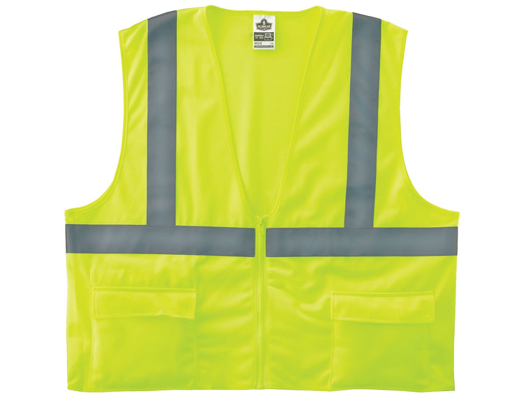 Ergodyne® GloWear® 8225Z 4XL/5XL lime class 2 Hi-vis standard vest with 2" reflective tape is made of 3.6 oz polyester solid for longer life. Vest with zipper closure includes an inside and 2 outside pockets for more comfort.