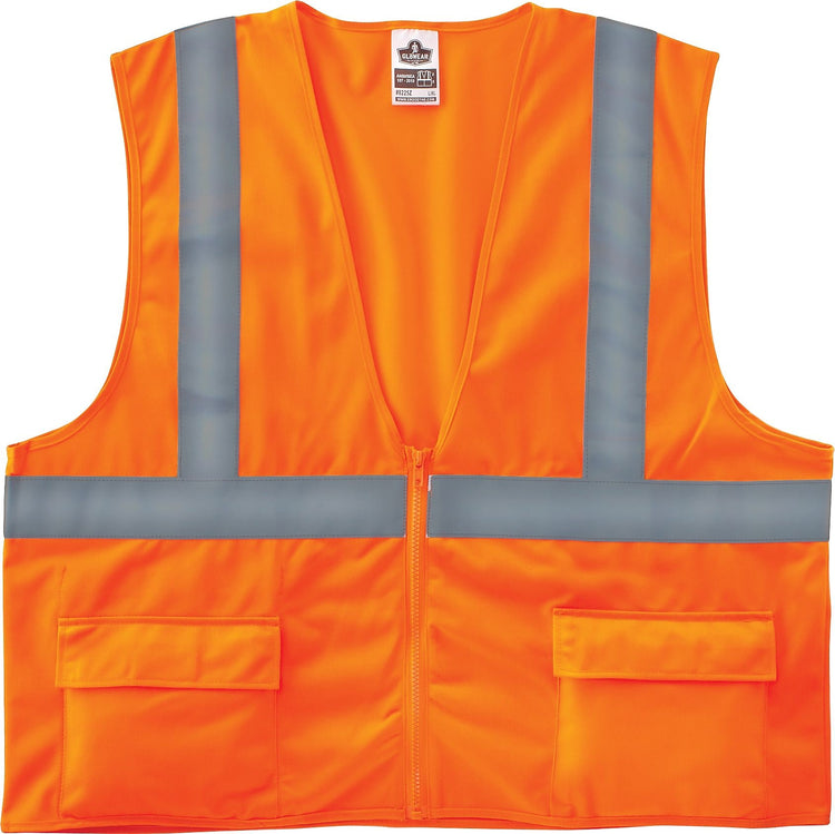 Ergodyne® GloWear® 8225Z 2XL/3XL orange class 2 Hi-vis standard vest with 2" reflective tape is made of 3.6 oz polyester solid for longer life. Vest with zipper closure includes an inside and 2 outside pockets for more comfort.