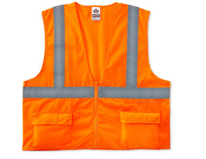 Ergodyne® GloWear® 8225Z 4XL/5XL orange class 2 Hi-vis standard vest with 2" reflective tape is made of 3.6 oz polyester solid for longer life. Vest with zipper closure includes an inside and 2 outside pockets for more comfort.